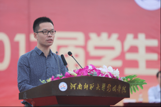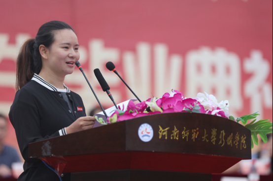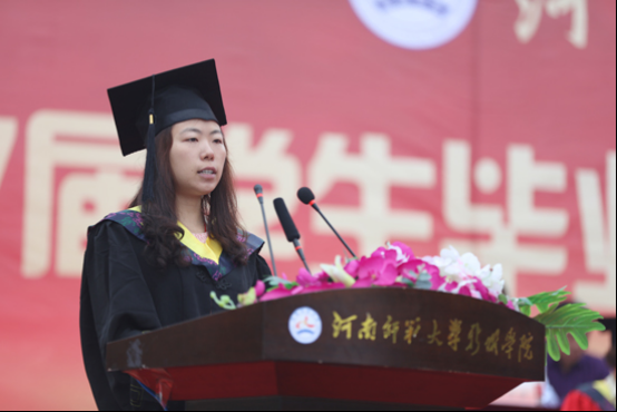 毕业生代表、材料成型及控制工程专业张婷同学代表全体毕业生,向母校的老师们表达了深深的感激之情。她号召所有毕业生,时刻肩负起新联学院的光荣和使命,努力学习,认真工作,以优异的成绩彰显新联学子的风采,立志为母校争光。毕业生家长代表、财务管理(会计方向)白冰洁家长武会中代表各位家长,祝河南师范大学新联学院桃李芬芳,蒸蒸日上;祝愿各位毕业生一帆风顺,前程似锦。校友代表、2007届中文系优秀毕业生张润杰告诫毕业生们要“在未知中尝试、在已知里坚持”,时刻反省自我,和内心对话。在校生代表、2014级汉语言文学(企业秘书方向)刘一帆表示,在校生要向广大毕业生看齐,在今后的生活中,把握机遇,努力学习,学在新联,成在新联,在新联学院良好的育人氛围下,用青春和智慧续写新联学院的辉煌篇章。教师代表、教育学院赵双兰回顾了她与同学们在新联学院珍贵而特殊的点点滴滴,希望毕业生们一如既往的关注学校的发展,常回家看看。