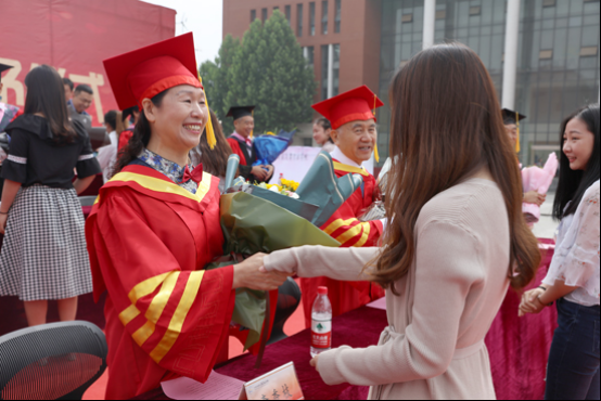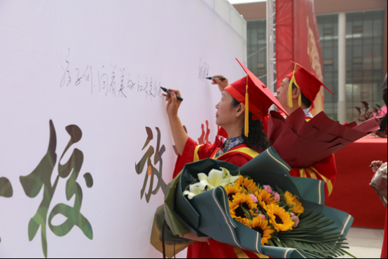 李香枝女士朴实的话语、真挚的感情赢得了广大毕业生潮水般的掌声。伴随着《感恩老师》的动人旋律,毕业生将一束束鲜花献给老师。典礼结束后,学校领导和毕业生分别在毕业墙上签名留念。