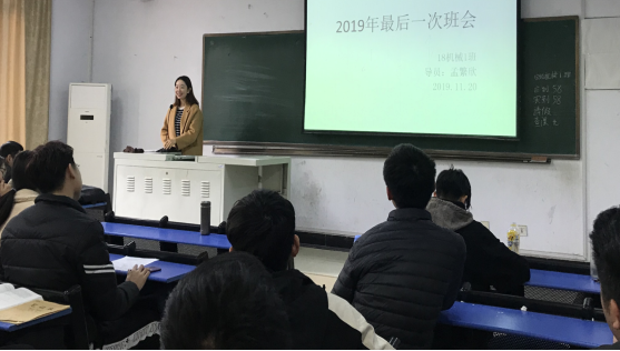 2019年11月25日,2018级机械设计一班辅导员及全体同学在文质楼306教室开展了2019年最后一次班会。这次班会意在带领全班同学对前开学以来的学习生活进行总结以及对期末的复习进行规划。