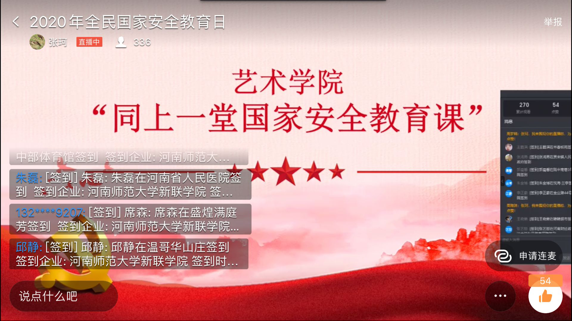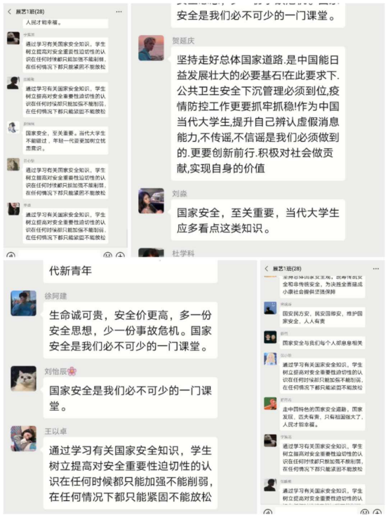为了加深学生对国家安全的理解和认识,艺术学院积极开展线上讨论,通过采用师生“云”分享、主题“云”班会、在线党团活动、参与国家安全知识在线问答、书写观后心得体会等形式,深入学习以习近平同志为核心的党中央关于国家安全的决策部署,认真学习公共卫生安全、生物安全等宣传教育活动。