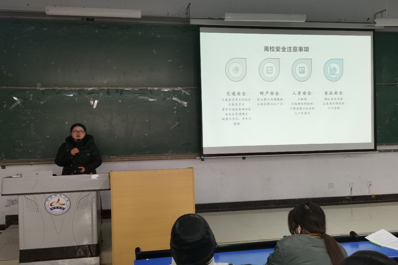 为增强同学们的安全意识,切实保障同学们离校时的人身安全。2020年12月17日上午,2019级国际经济与贸易、市场营销和会计专业的全体学生在文质楼213教室召开离校安全教育主题班会,此次会议由辅导员杜静静主持。