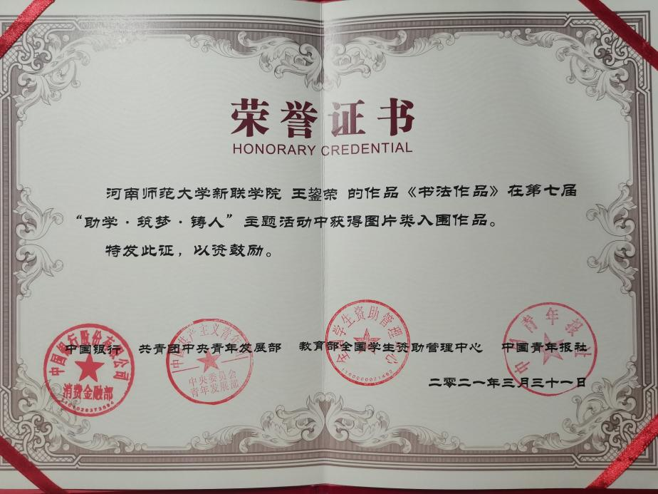 近日,由教育部全国学生资助管理中心、团中央青年发展部、中国银行以及中国青年报社主办的第七届“助学·筑梦·铸人”主题活动评选结果公示。中原科技学院艺术学院2020级视觉传达设计专业王鋆荣同学的作品《书法》,经过层层选拔获得图片类优秀作品。