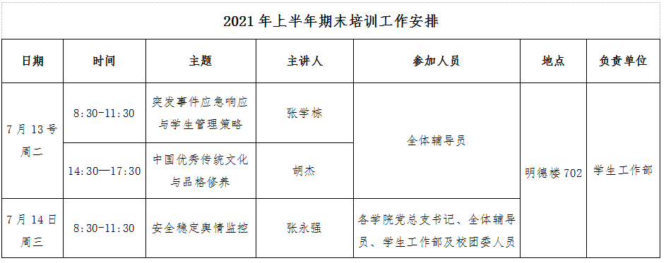 为进一步加强我校辅导员队伍建设,不断增强学生思想政治教育工作的针对性和实效性,推进学工队伍专业化、职业化发展,根据人力资源处培训工作通知要求,现将2021年上半年期末学生工作人员培训安排通知如下: