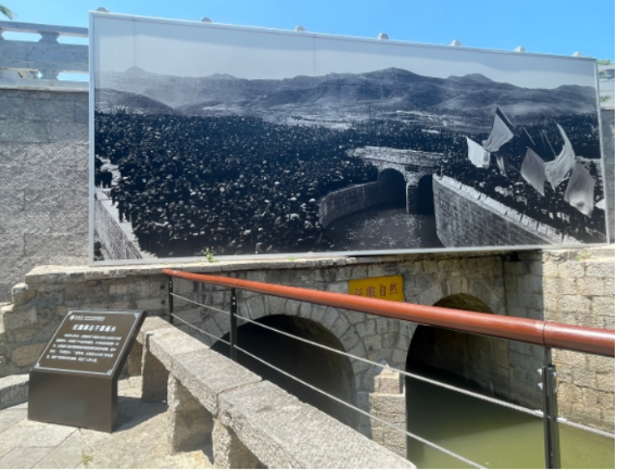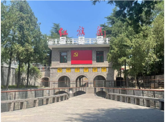 红旗渠分水闸始建于1960年初期,总干渠在此分开形成流向西南、东南、东北的一、二、三干渠,是红旗渠总干渠的分水枢纽工程,区水资源调配发挥了重要作用。在带队老师沈炜炜的组织下,实践团队成员们沿着渠岸探访到了分水闸,首先映入眼帘的则是分水闸的纪念楼,在纪念楼的楼顶高悬着郭沫若亲手提笔的苍劲有力的“红旗渠”三个朱红大字,在分水闸的一侧有一幅图片是“红旗渠总干渠通水”的画面,在图片中人山人海,大家都欢呼雀跃庆祝着这个伟大工程的顺利完成,从图片中我们切实地感受到了修建红旗渠的不易和林县人民的高兴。
