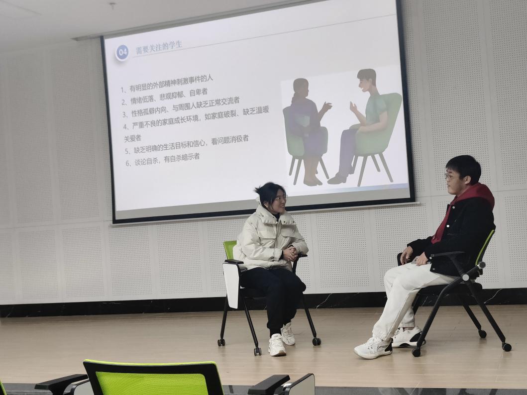刘玉林老师通过阐述心理异常与心理危机的识别、评估、预防与干预过程中的难点与重点,着重介绍了大学生常见心理疾病症状,最后进行了心理健康教育中心老师与辅导员的模拟访谈,心理健康教育中心通过展示两种模拟访谈的形式,让在座辅导员能够直观学习访谈流程,方便辅导员更快捷敏锐的察觉到学生的异样并及时加以干预,更好护航学生的成长。