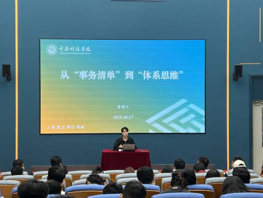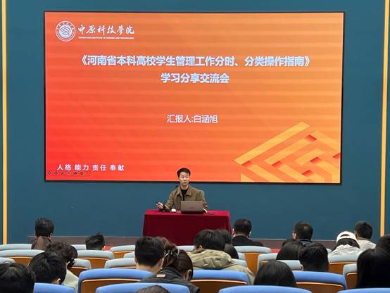 为深入学习贯彻习近平新时代中国特色社会主义思想,全面贯彻落实习近平总书记关于教育的重要论述和全国、全省教育大会精神,加快推进我校学生教育管理工作高质量发展。10月17日,学生发展处牵头组织了2025年秋季学期政工干部培训启动仪式暨《河南省本科高校学生管理工作分时分类操作指南》专题学习分享交流会(以下简称《指南》)。此次会议在立业楼S100举行,中原科技学院全体政工干部参会,学生发展处处长王贺振主持。
