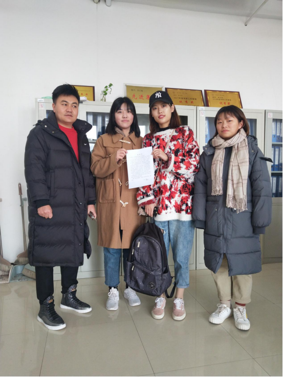 曹力丹(右二)向陈佳璐、任安琪和其辅导员杨明辉送达感谢信 12月13日上午,我校学生曹力丹带着感谢信来到学工处,感谢文学与传媒学院的陈佳璐、任安琪两位同学拾金不昧,及时送还她丢失的钱包、书包等物。11月11日晚,曹力丹在文质