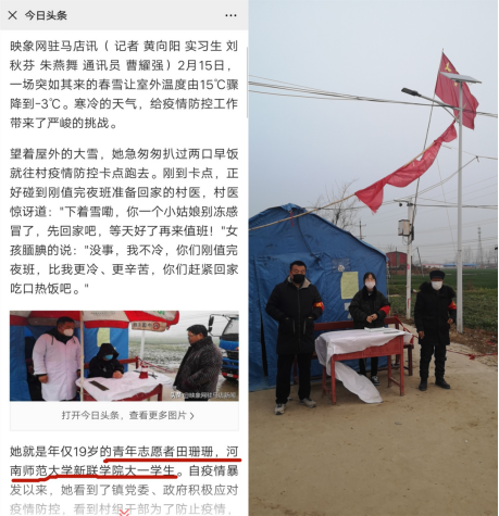 “尽管面对疫情有些害怕,最终我还是鼓起勇气,主动联系到党店镇团委要求走到防疫一线。”2019级学生田姗姗说。在征得同意后,她当天就在郁王村卡点上岗了。此后不管刮风下雨,她每天早上7点就会准时出现在疫情防控卡点,对进出的村民进行体温监测和登记、对非本村人员和车辆进行劝返。除此之外,她还和村委一起到村内宣传预防疫情的相关知识。有时看村组干部太累了,她还主动要求担任上半夜的值班工作,不叫一声苦、不喊一声累。